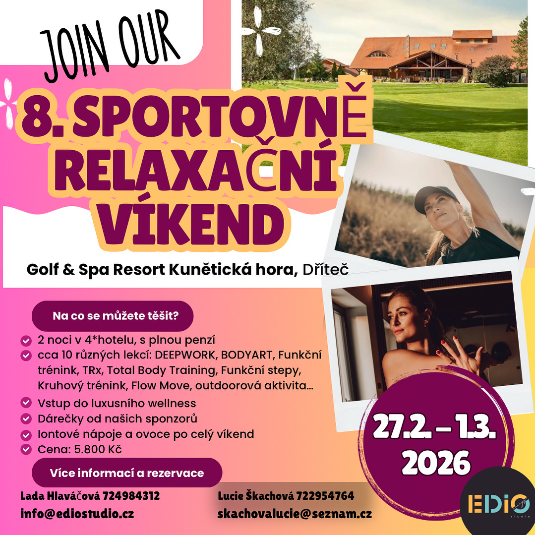 - 2 noci v 4*hotelu s plnou penzí, cca 10 různých lekcí, vstup do wellnes, skvělá parta lidí, spoustu pozitivní energie, legrace. Krasné dárečky od sponzorů. To vše a mnohem víc pro vás chystají instruktorky Lada s Luckou.